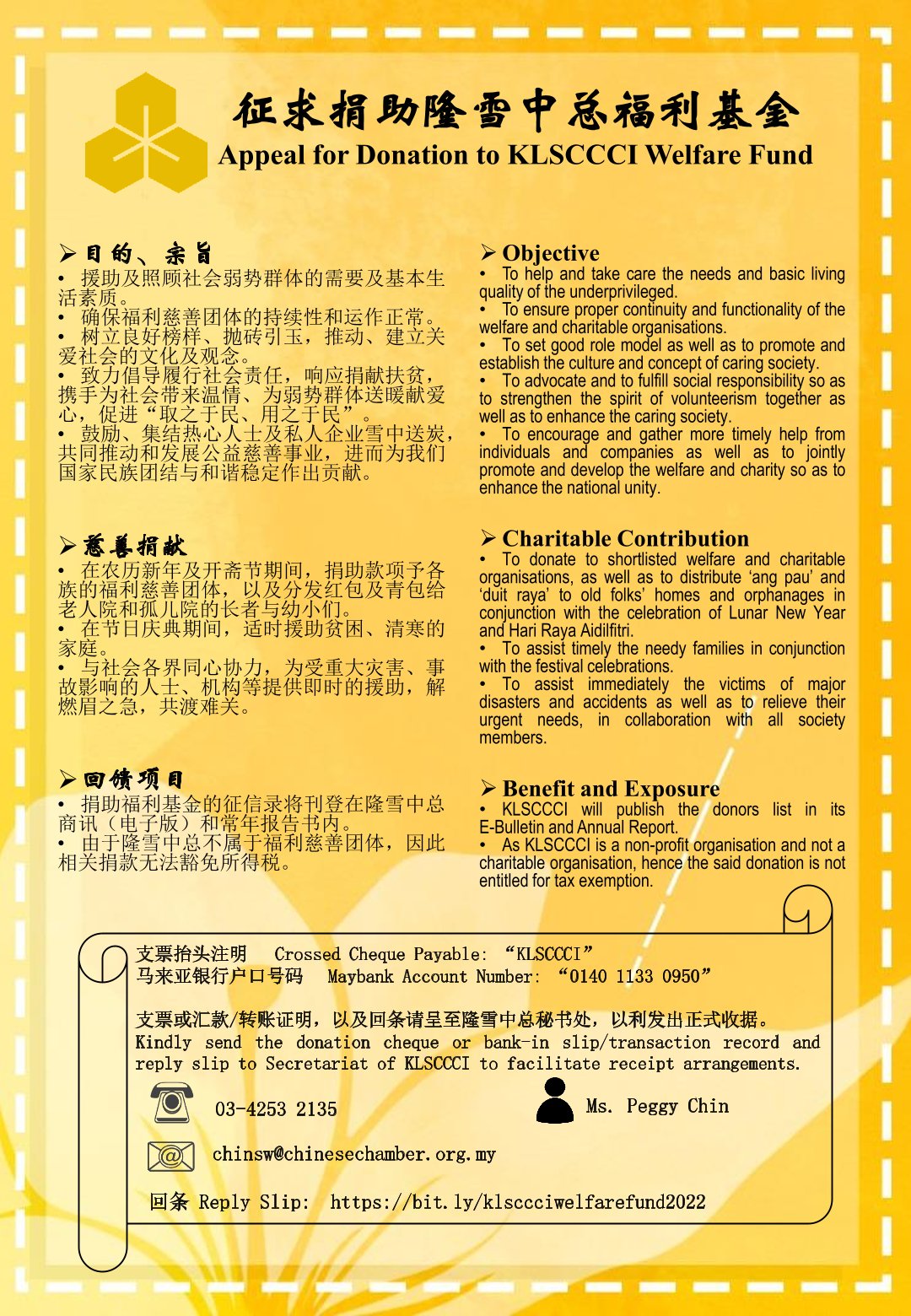 We would like to seek generous support from KLSCCCI’s members by donating to the Welfare Fund, to promote the spirit of volunteerism and social responsibility together as well as to enhance the caring society and national unity.