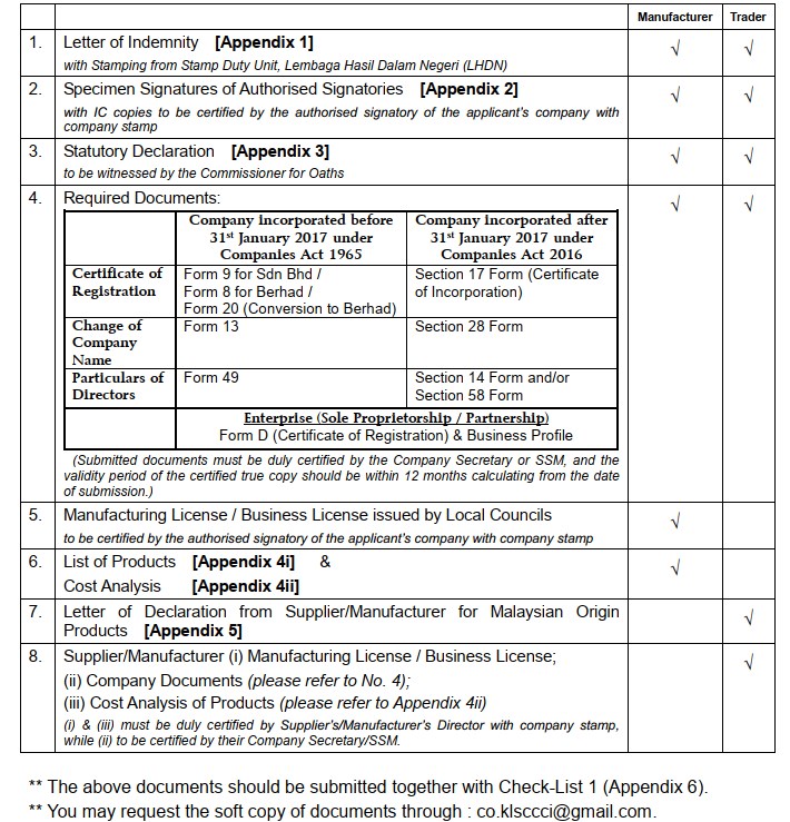 Please be informed that your esteemed company is required to submit the following documents to the Chinese Chamber of Commerce and Industry of Kuala Lumpur and Selangor (KLSCCCI) for the year 2022 to facilitate the Certificate of Origin endorsement: