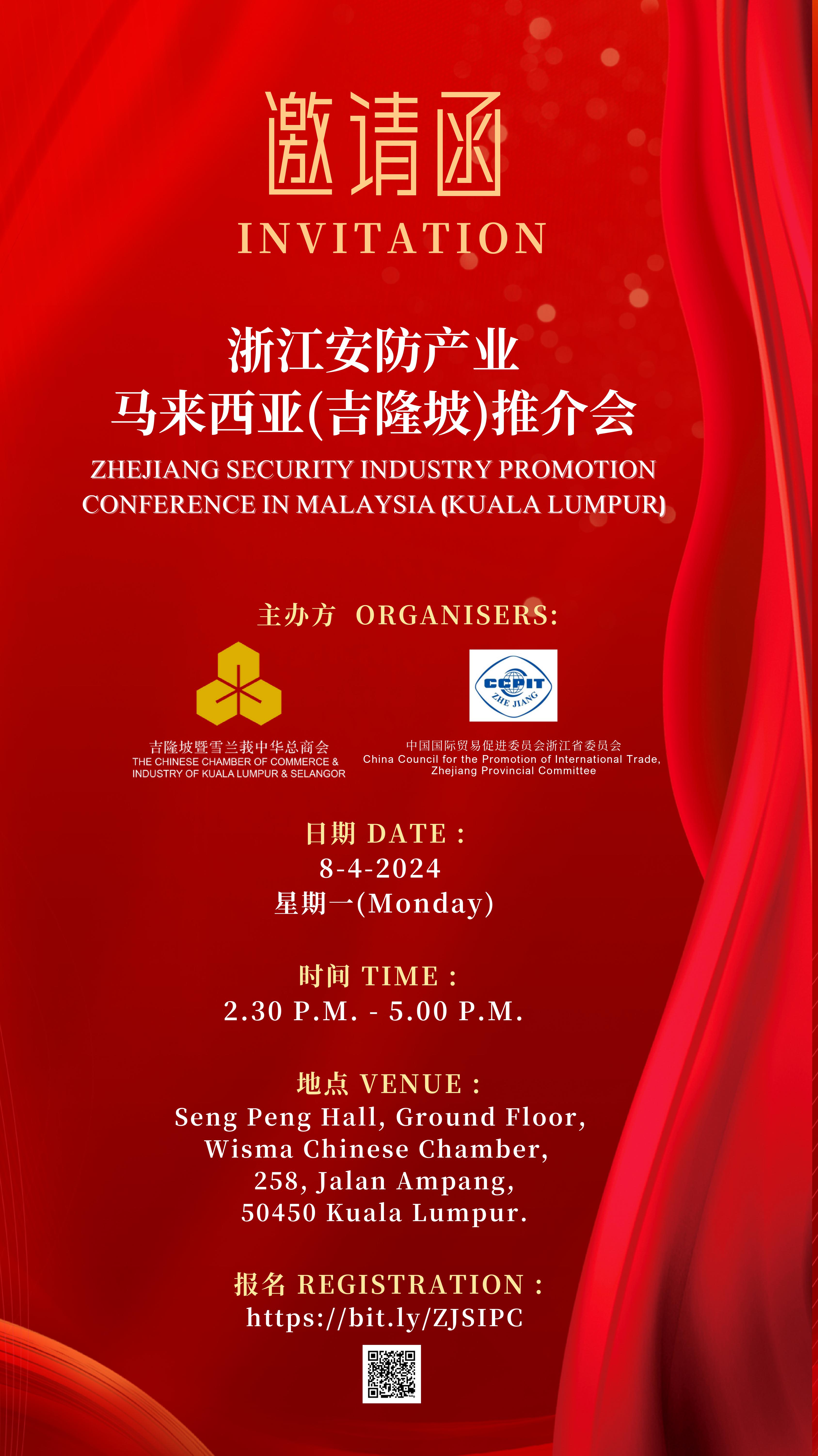In order to promote the trade and economic relationship and cooperation between Zhejiang Province, China and Malaysia, the Chinese Chamber of Commerce and Industry of Kuala Lumpur and Selangor (KLSCCCI) together with China Council for the Promotion of International Trade, Zhejiang Provincial Committee will jointly host the “ZheJiang Security Industry Promotion Conference in Malaysia” on 8th April 2024 (Monday). Details are as follows: